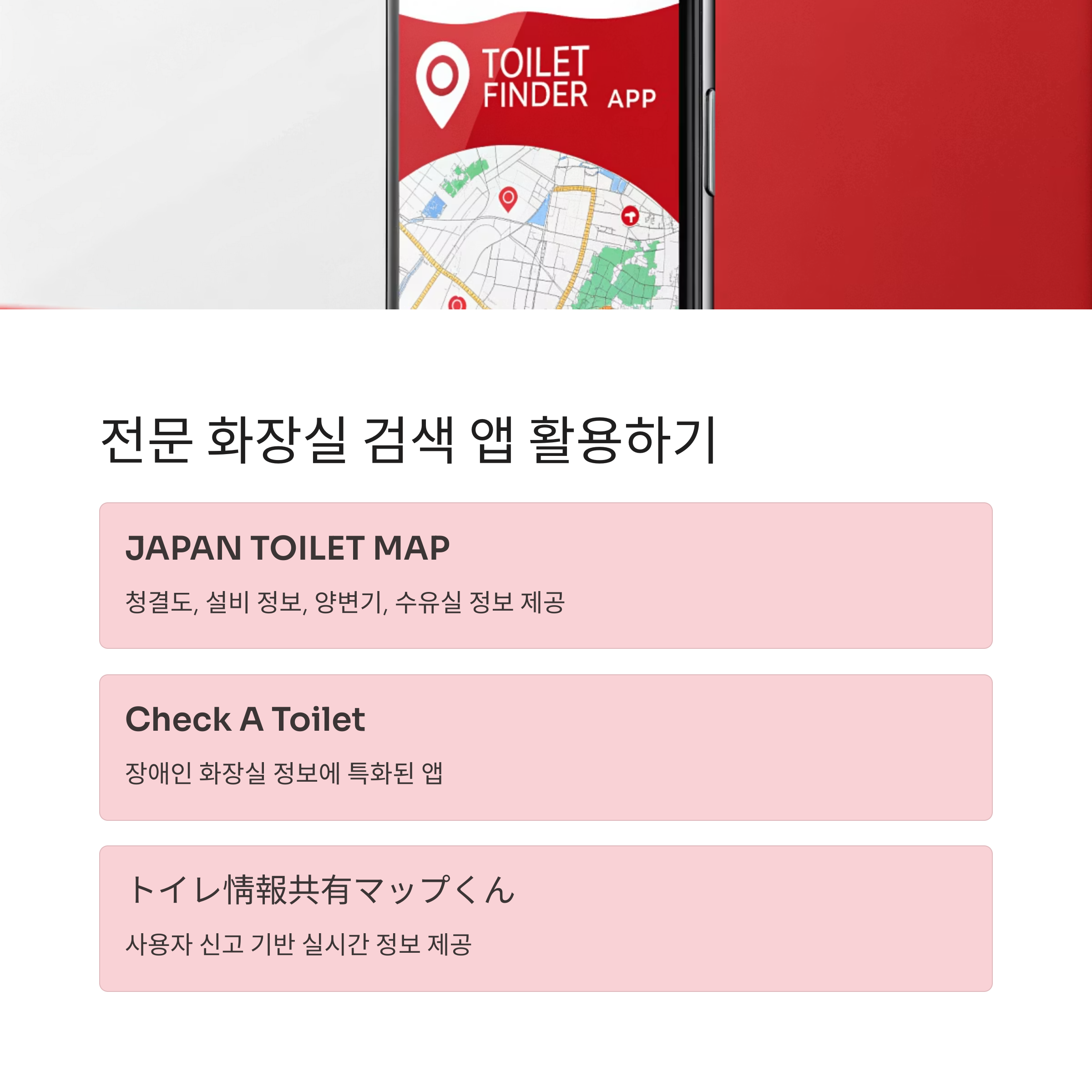 하지만 낯선 곳에서는 위치를 몰라 헤매기 쉬우므로, 지도 앱과 화장실 전용 앱을 함께 활용하는 것이 가장 효율적입니다.